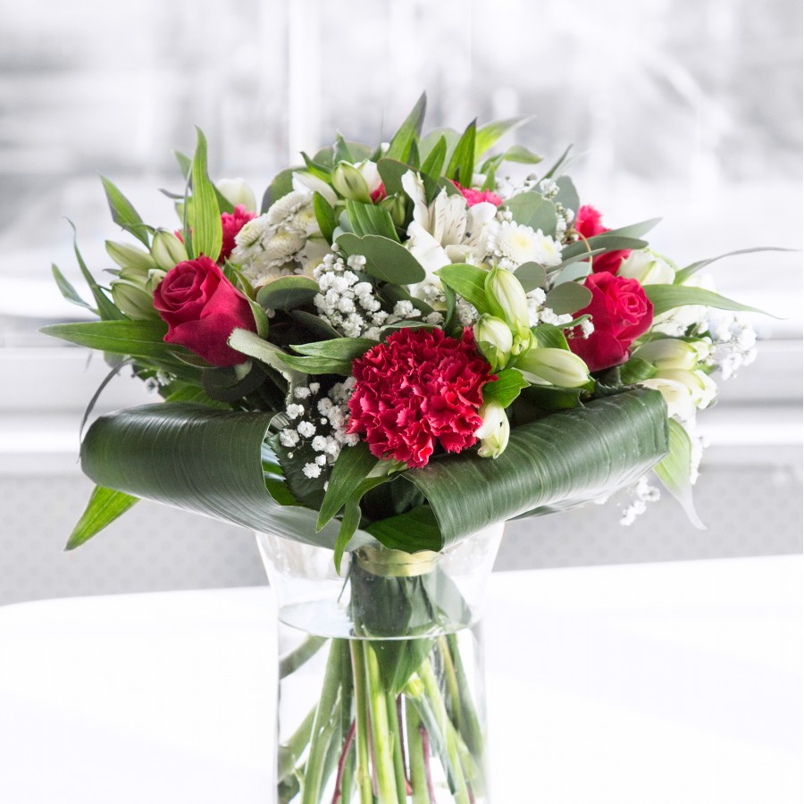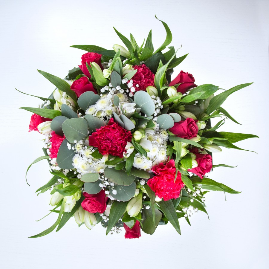 Delight in the uniqueness and freshness of our handcrafted bouquet, featuring white chrysanthemums, delicate gypsophila, luxurious red roses, vibrant carnations, pristine white alstroemeria, and lush aspidistra leaves. Each flower is hand-selected to ensure superior quality and longevity.